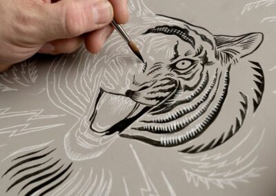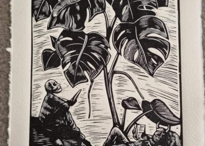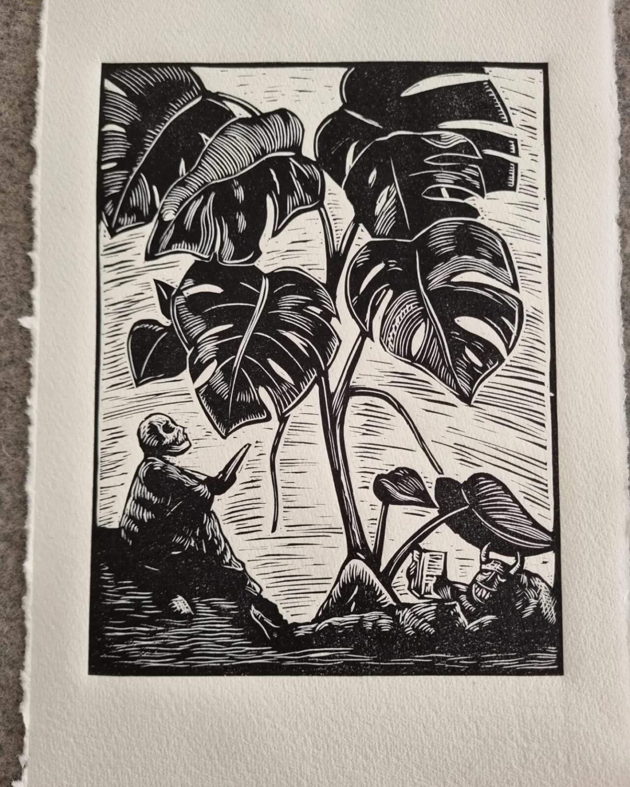 El grabado en linóleo es una técnica artística de impresión que permite crear imágenes mediante el tallado de planchas de linóleo. A diferencia de la xilografía (grabado en madera), el linóleo ofrece una superficie más blanda y uniforme, lo que facilita el tallado y permite obtener trazos limpios y definidos.